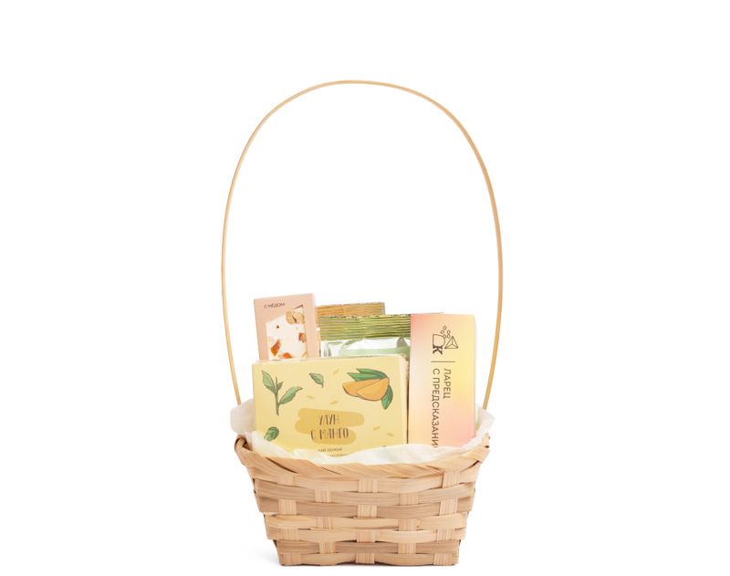 Устройте приятный сюрприз уважаемому учителю! В изящной плетеной корзине мы собрали ароматный улун с сочными кусочками манго, согревающий купаж черного чая «Дикие ягоды» и классический зеленый чай «Белый пух» с приятными травянистыми нотами. Воздушная нуга «Сицилийский поцелуй» и три аппетитные конфеты из ларца станут отличным дополнением к десертам. Изюминкой станет приятное предсказание, которое учитель найдет на внутренней створке ларца!