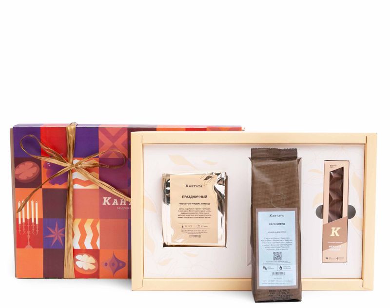 Бодрость и релакс идут рука в об руку в этом чудесном новогоднем подарке: классический «Хаус Бленд» для приготовления самых вкусных кофейных напитков и купаж черного чая «Праздничный» с ярким новогодним звучанием. На десерт – плитка тающего во рту шоколада «Нежные облака».