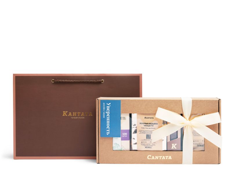 Что может быть приятнее, чем ароматный чай в компании плитки шоколада? В этом подарке мы собрали три вида чая — классический черный чай «Золотая обезьяна» с медовыми нотами, ароматный купаж «Дикие ягоды» и нежный зеленый чай «Зелёная улитка» с цветочно-лимонным ароматом. Чтобы готовить напитки было удобно, добавили фильтр-пакеты для заваривания. На десерт в подарке найдутся плитка молочного шоколада «Нежные облака» и горький шоколад «Колумбия» с насыщенным ароматом какао и нотами меда, орехов и специй.
