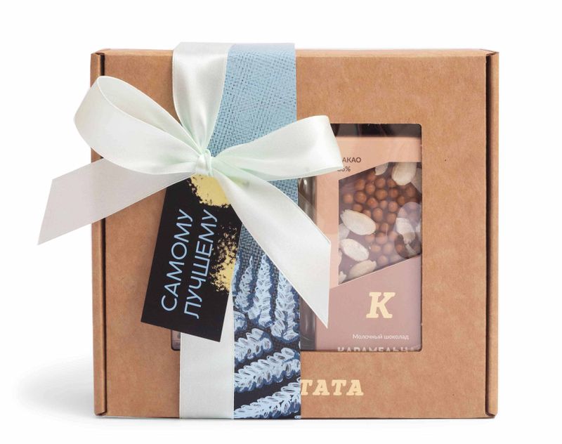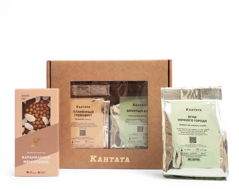В этот подарок мы положили три вида чая «с огоньком» — это черный чай с грейпфрутом и два вида ярких купажей на основе зеленого чая. Плитка шоколада «Карамельная жемчужина» станет отличным дополнением к горячим напиткам.