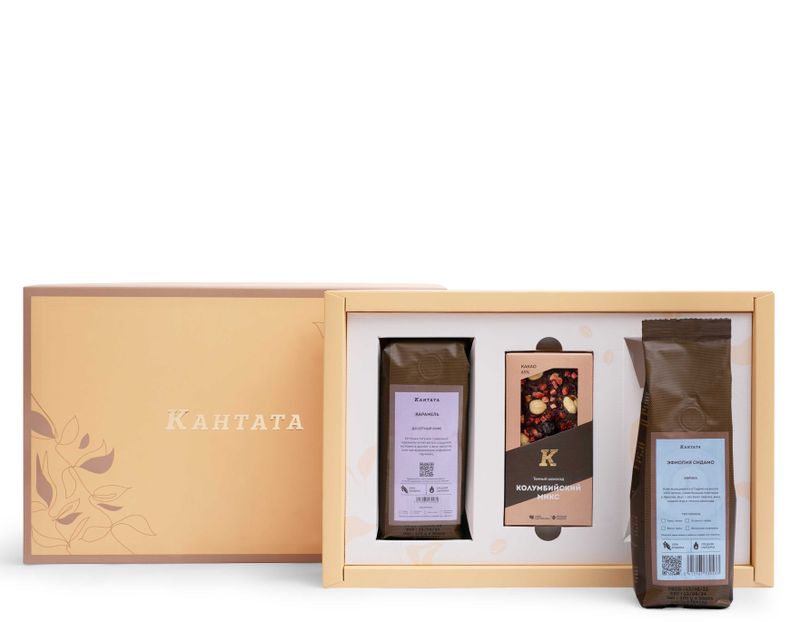 Момент изысканных кофейных открытий! В коробку мы вложили два сорта кофе – классический «Эфиопия Сидамо» с нотками молочного шоколада в аромате и десертный «Карамель» с аппетитным звучанием тягучей сладости. На десерт – темный шоколад с орехами и ягодами «Колумбийский микс».
