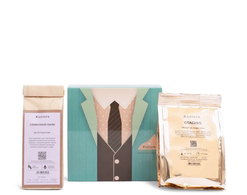 Приятный и вкусный сюрприз на праздник! Внутри подарка найдутся два согревающих напитка – купаж черного чая с говорящим названием «Спасибо» и десертный кофе «Сливочный ликер» с аппетитным согревающим звучанием известного напитка.