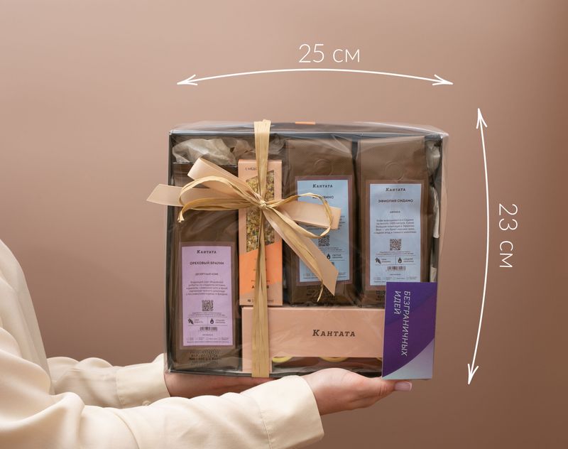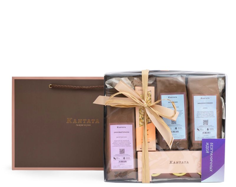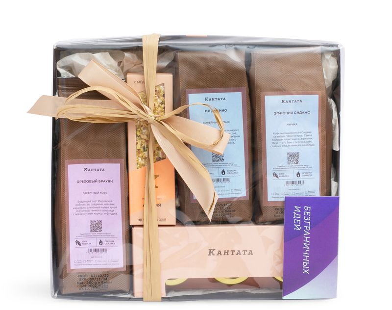 Насыщенный кофе ждет внутри! В подарке мы объединили три сорта — классические Эфиопия Сидамо и Ил Дивино дополнили десертным кофе «Ореховый Брауни» с ароматом знаменитой выпечки. К напиткам добавили в подарок набор «Маленькие радости» из баночек с тремя сладостями, а также воздушную нугу «Аравия» с фисташкой и инжиром.