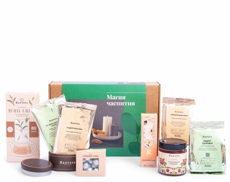 Стильный подарок, в котором мы собрали целую коллекцию ароматного чая и десертов! В коробке – классический черный чай «Индия Нилгири» с нотками красной смородины, десертный купаж черного чая «Черничный морс», купажи зеленого чая с ярким вкусом и ароматом «Все девушки любят малину» и «Рецепт здоровья», а также нежный гречишный чай с кусочками манго, по аромату напоминающий сливочное печенье. Чтобы напитки было удобно заваривать, добавили фильтр-пакеты, а для хранения – стильную жестяную баночку. На десерт – цветочный крем-мед «Малиновый медведь», сладкая и мягкая нуга с чарующим вишневым ароматом и нарядные серебристые драже «Сильвер соль».
