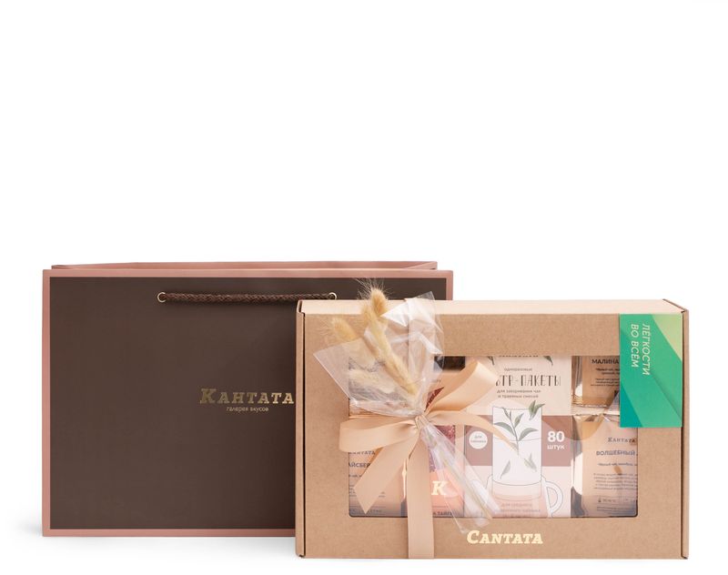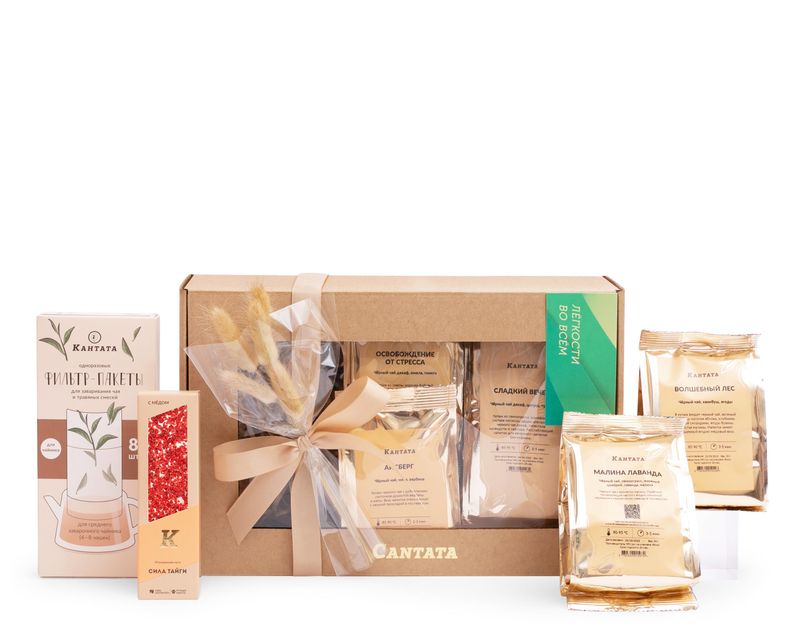 Напитки из этого набора помогут достичь гармонии! В подарок мы вложили пять сортов чая — успокаивающий «Освобождение от стресса», освежающий «Айсберг», душистый «Волшебный лес», мечтательный «Сладкий вечер», а также купаж «Малина-Лаванда», который ароматом подарит мечтательное настроение. Чтобы каждое чаепитие проходило с комфортом, в набор мы добавили удобные фильтр-пакеты для заваривания. Вкусным дополнением напитков станет воздушная нуга «Сила Тайги» с неповторимым звучанием хвойного леса.