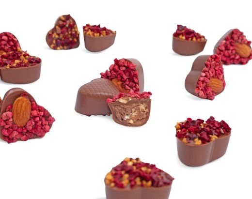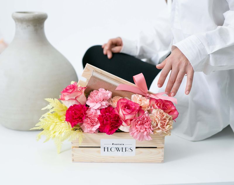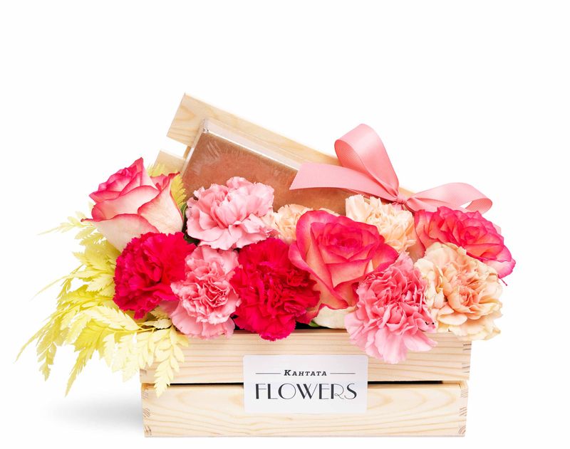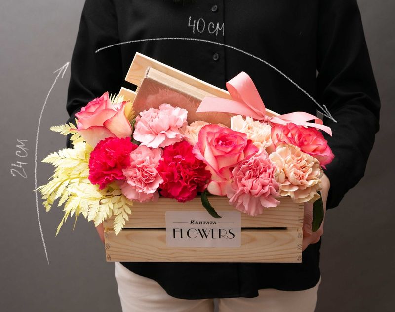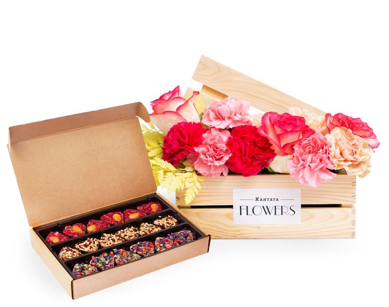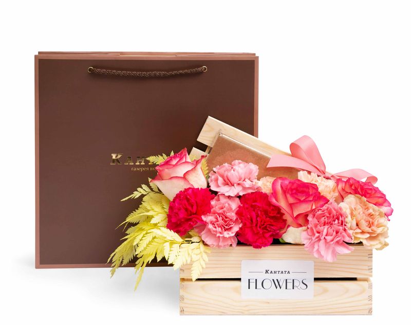 Стильный подарок, который венчает ароматная композиция из нежных живых цветов. Под бархатными лепестками скрывается набор из восемнадцати конфет ручной работы линейки «Признание».