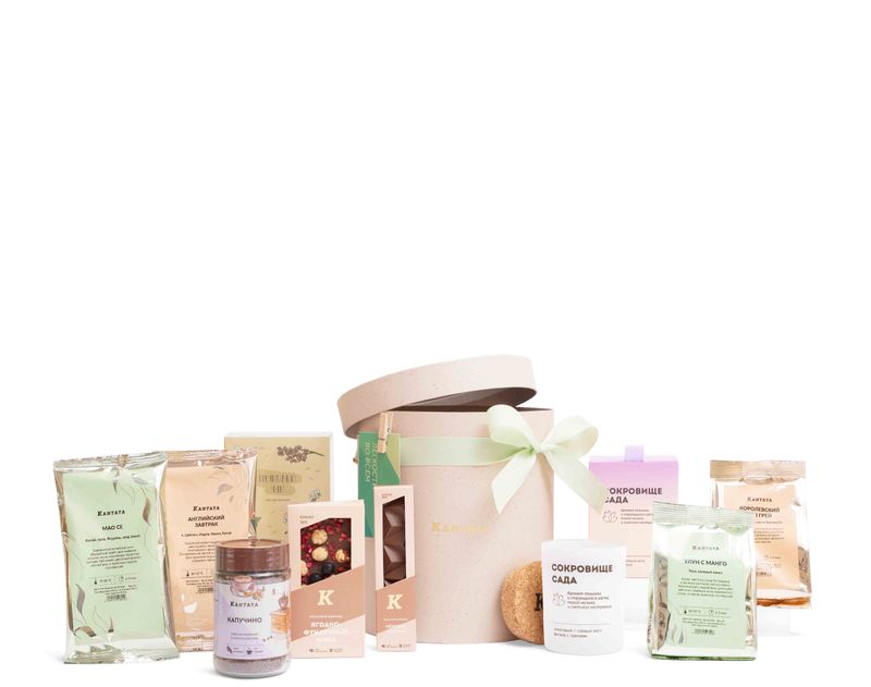 Изящная шляпная коробка, скрывающая богатую палитру вкусов и ароматов! В подарок мы вложили пять сортов чая – легендарный «Королевский Эрл Грей», насыщенный «Английский завтрак» солнечный «Улун с манго», освежающий «Мао Се» и уютный «Гречишный чай». Также добавлю баночку растворимого кофе «Капучино», а к напиткам – две плитки шоколада ручной работы. Сердцем подарка стала ароматическая свеча «Сокровище сада», которая наполнит дом звучанием свежести и юных цветов и уютным потрескиванием фитиля.