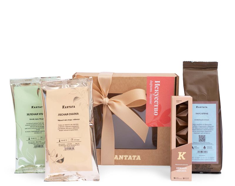 В коробку с дизайнерским оформлением мы вложили три вида напитков – классический зеленый чай «Зеленая улитка» с цветочно-лимонным ароматом, купаж черного чая «Лесная сказка» с ягодами и классический купаж арабики «Хаус бленд» с обволакивающим послевкусием. На десерт добавили шокобар «Нежные облака».