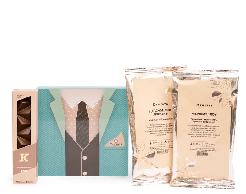 Выразите свою признательность вместе с этим подарком! В набор мы добавили два ароматных напитка — классический черный чай Дарджилинг Джиэль с изысканной вяжущей нотой белого вина, а также черный чай «Маршмэллоу» со сладким зефиром в купаже. Вкусным дополнением чаепития станет шокобар «Перу» из отборных какао-бобов.