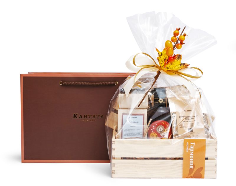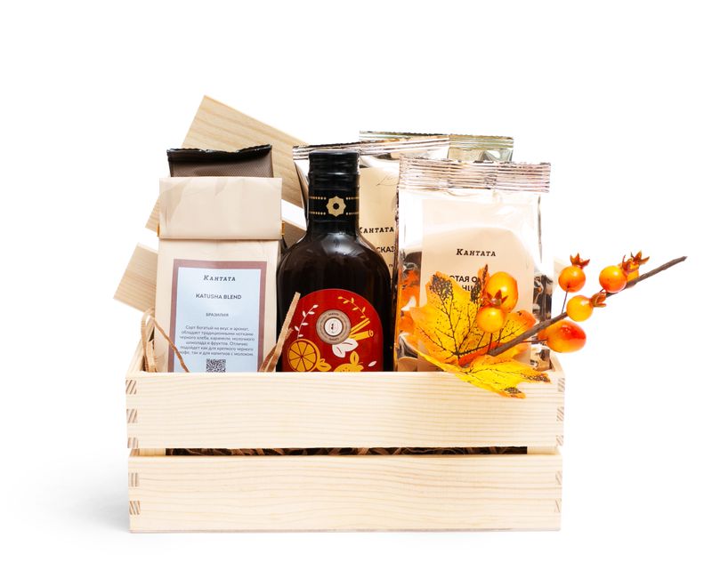 Стиль и уют в одном флаконе! В набор мы вложили три вида чая – купаж черного чая «Лесная сказка» с ягодами и гибискусом, классические сорта черного и зеленого чая «Золотая обезьяна» и «Зеленая улитка». Дополнили подарок двумя видами кофе – классическим купажом арабики «Катюша бленд» и десертным «Ирландский крем» со сливочными нотами жгучего виски. Добавили в набор бутылку сироп-бальзама «Корица-апельсин», которым можно украсить вкус любимого напитка или выпечки.