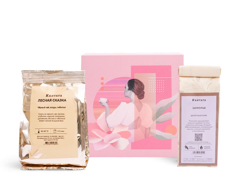 Прекрасный вариант для ценительницы ароматных напитков! В подарке — душистый купаж черного чая «Лесная сказка» с цветами, ягодами и фруктами, а также десертный кофе с аппетитным звучанием шоколада.