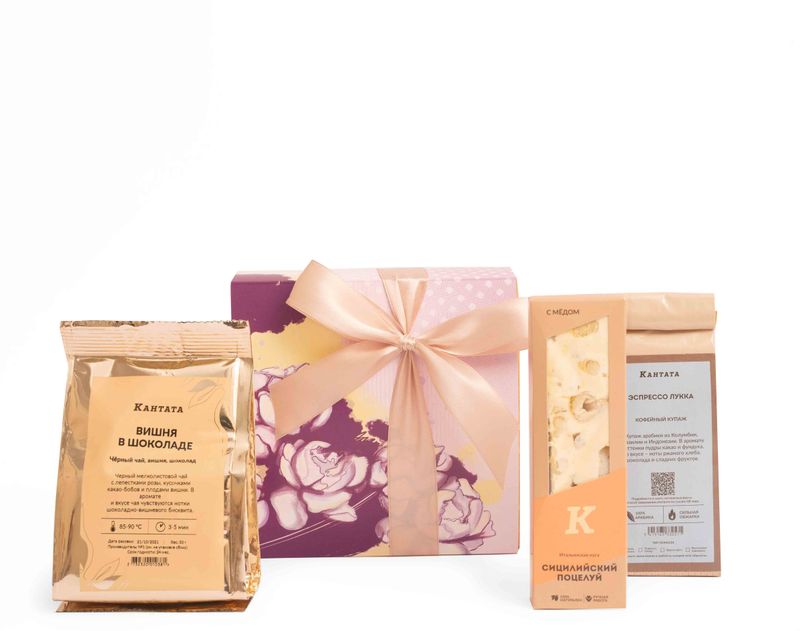 Изящный подарок, который точно придется по вкусу! В набор мы положили два согревающих напитка – кофе Эспрессо Лукка с нотками фруктов и табака и черный чай «Вишня в шоколаде» с лепестками розы. На десерт в подарке найдется тающая во рту нуга с цедрой и орехами кешью.