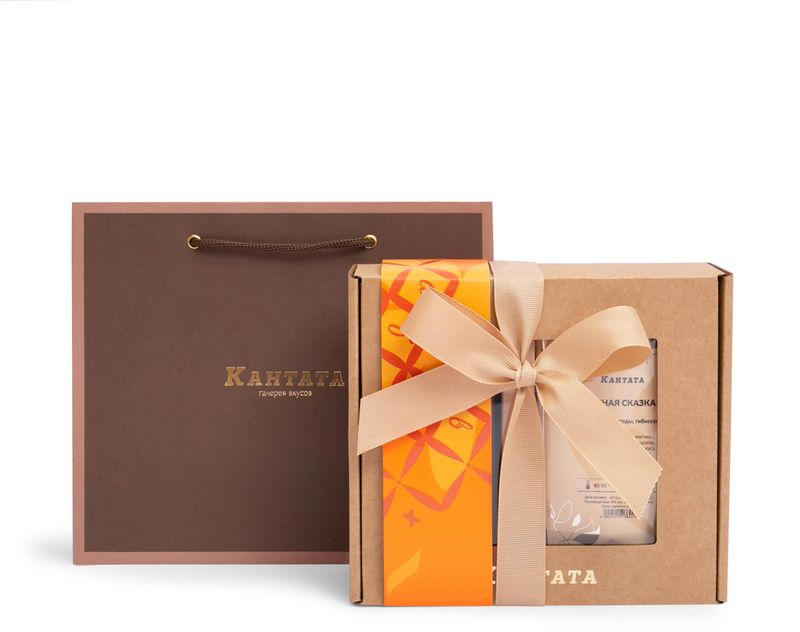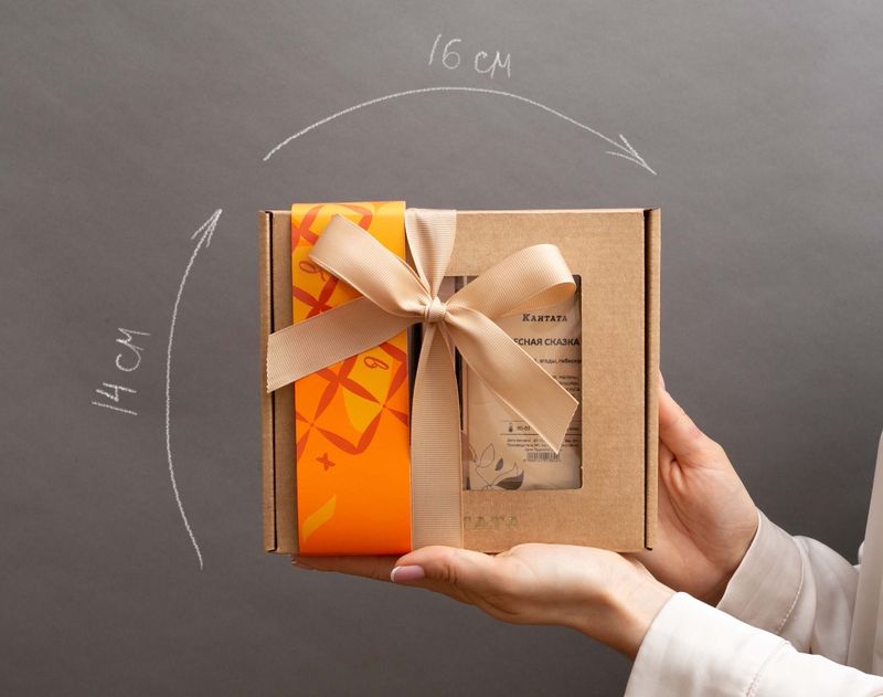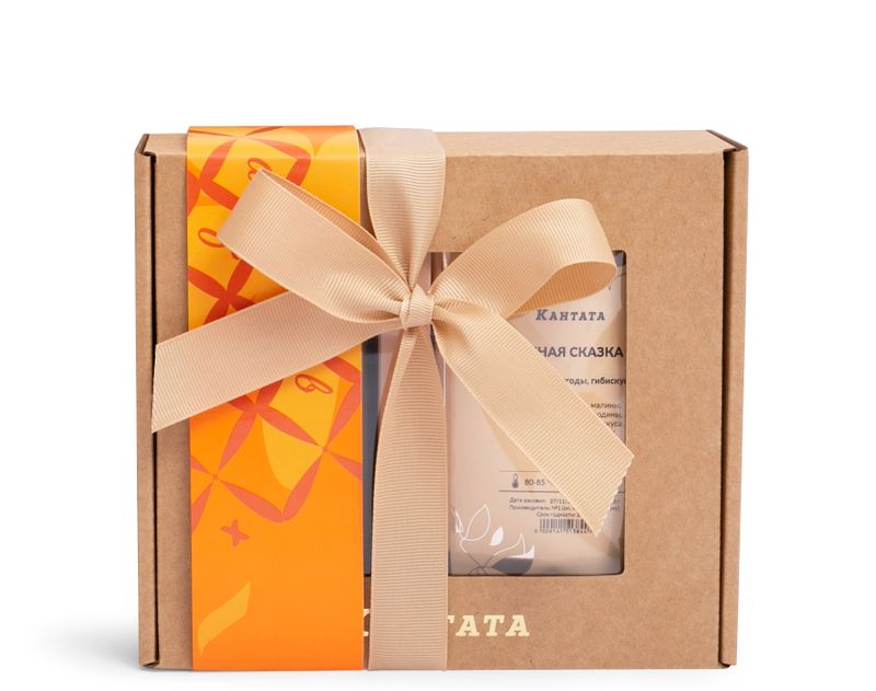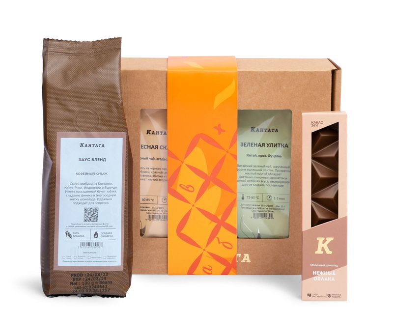 В коробку, украшенную изящной лентой, мы вложили три вида напитков – классический зеленый чай «Зеленая улитка» с цветочно-лимонным ароматом, купаж черного чая «Лесная сказка» с ягодами и классический купаж арабики «Хаус бленд» с обволакивающим послевкусием. На десерт добавили шокобар «Нежные облака».