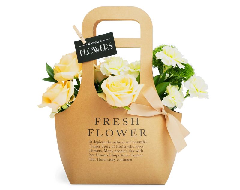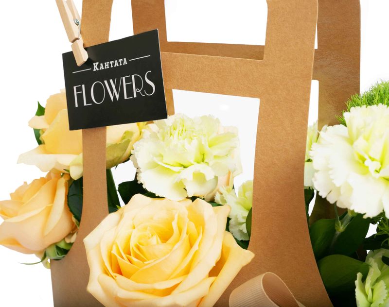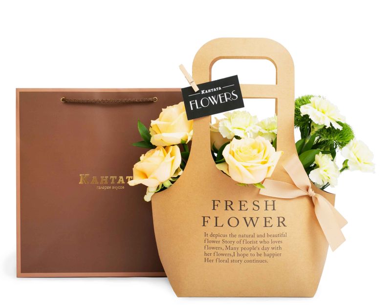 Изящная сумочка, в которой мы собрали душистые живые розы и диантусы, дополнили их гвоздикой и сочными листочками рускуса.