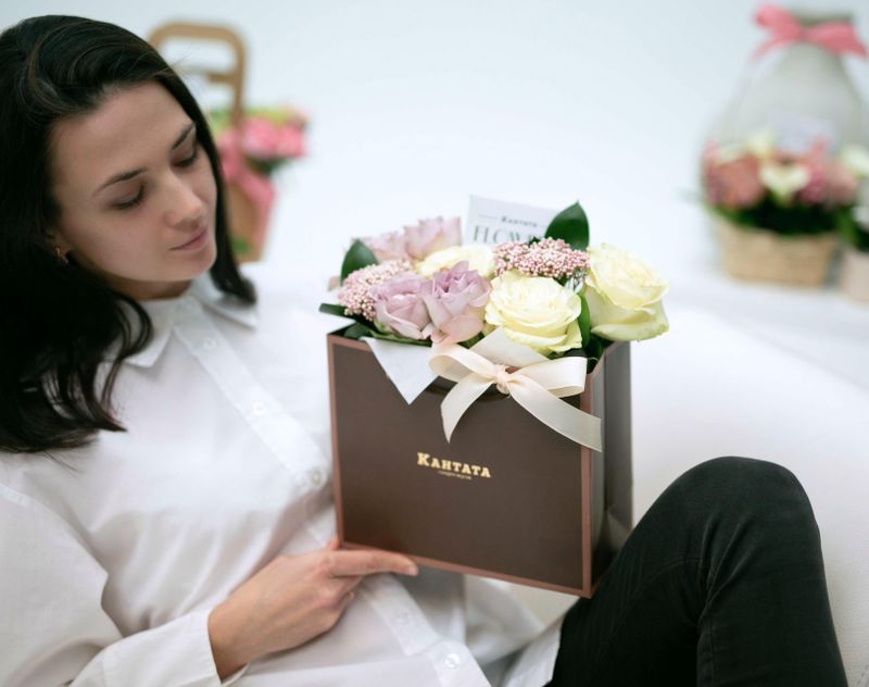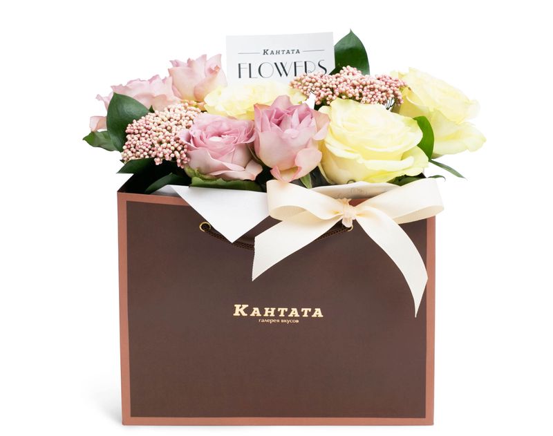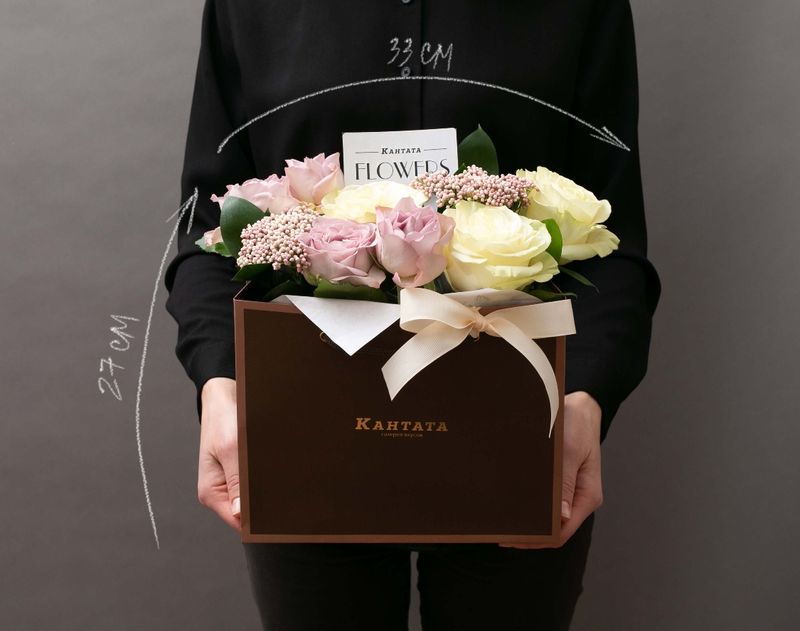 Элегантная сумочка, полная живых ароматных роз, которые обрамляют сочные листочки рускуса и озотамнус.
