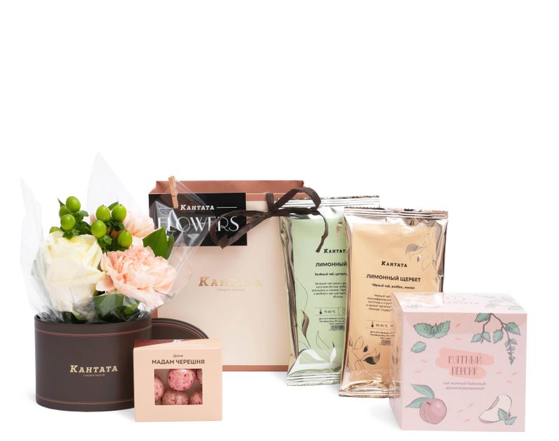 Мечтательный подарок, украшенный композицией из живых роз и гвоздик с листочками рускуса и гиперикумом. В набор мы также поместили напитки — «Лимонный щербет» и «Лимонный лёд» с незабываемым цитрусовым звучанием, а также «Мятный персик» в удобных индивидуальных пирамидках для заваривания. Дополнили подарок стильной жестяной баночкой для хранения, а на десерт вложили драже «Мадам Черешня» для сладкого акцента во время чаепития.