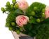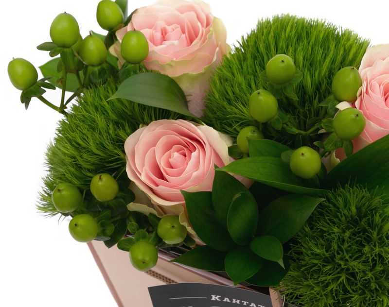 Пудровая сумочка, украшенная композицией из живых нежных роз и диантусов, дополненных листочками рускуса и веточкой гиперикума.