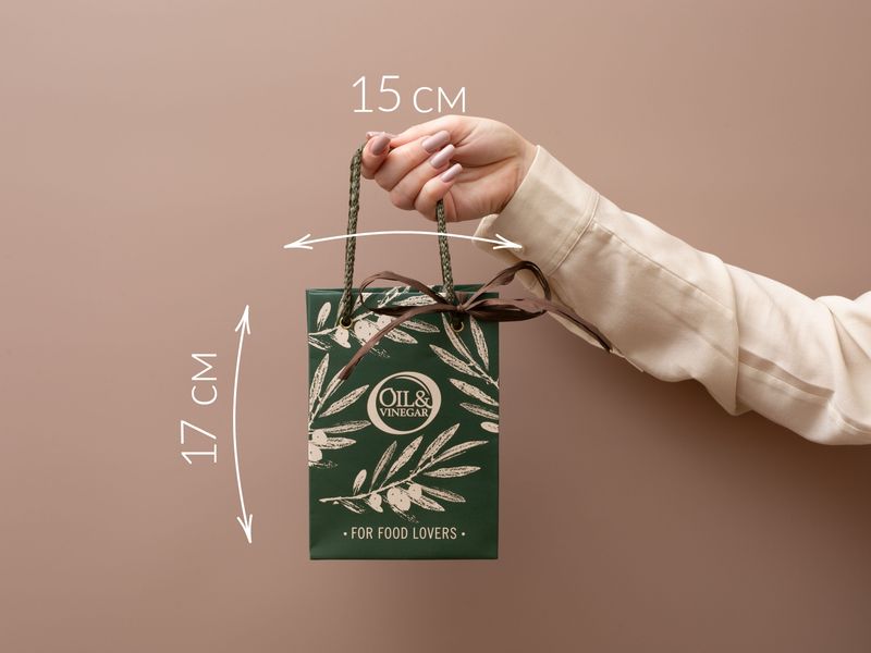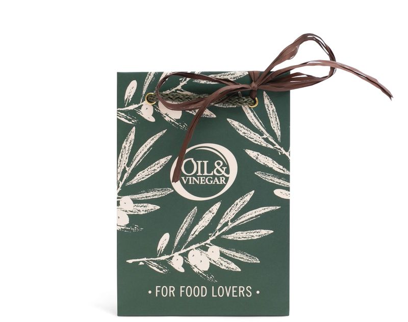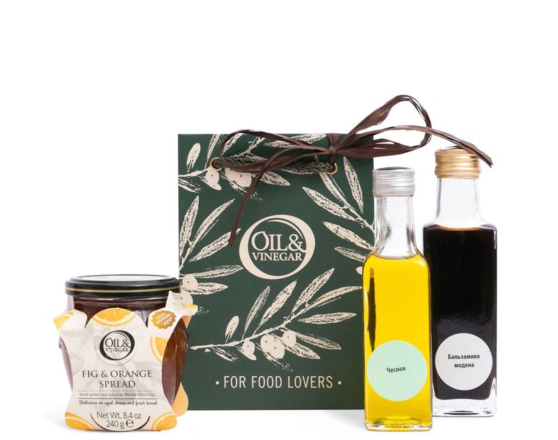 Стильная сумочка, в которой собрана палитра пряных вкусов — оливковое масло с огоньком чеснока, натуральный бальзамический уксус и спрэд с инжиром и апельсином.