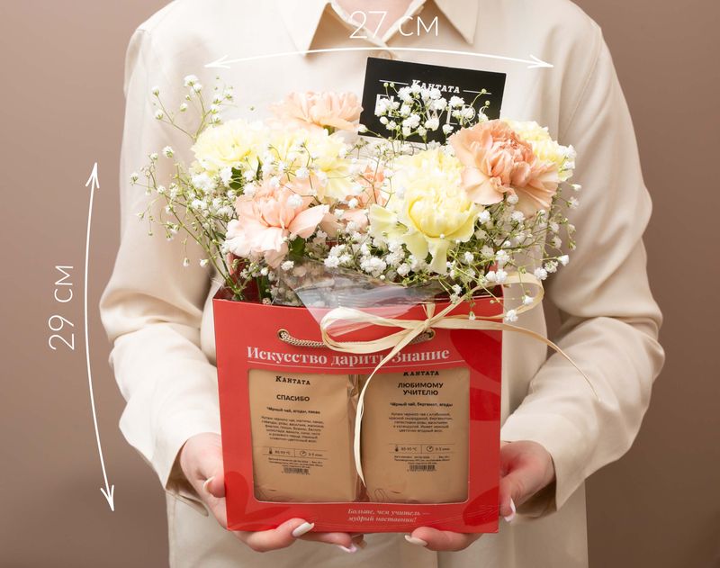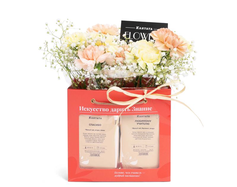 Такая сумочка станет приятным сюрпризом для любого учителя! Ее украшает по-весеннему нежная цветочная композиция, а из окошка видны два ароматных напитка — купажи черного чая с поистине говорящими названиями: «Любимому учителю» и «Спасибо».