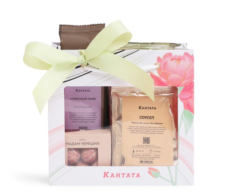 Стильная сумочка, внутри которой собрана коллекция напитков – три душистых чая и десертный сорт кофе, дополненные аппетитными драже ручной работы.