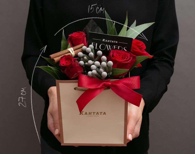 Очаровательная сумочка, полная юных душистых ароматов! В подарке мы собрали композицию из живых роз, дополнили цветы эвкалиптом, серебряной брунией и палочками корицы – символом уюта и тепла.