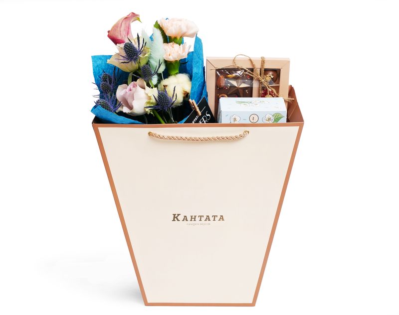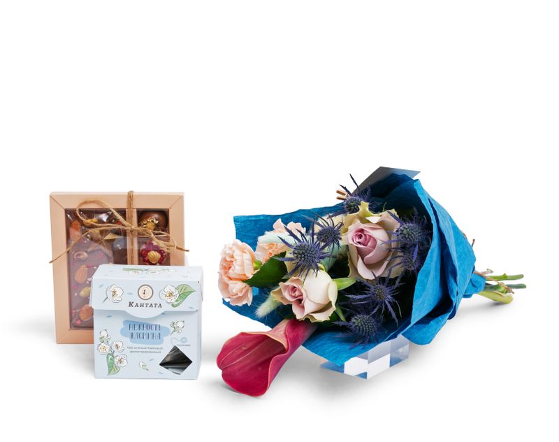 Ароматная композиция из нежных живых цветов станет великолепным подарком, ведь внутри нашего набора также найдутся душистый зеленый чай «Нежность жасмина» и эксклюзивный тематический набор десертов «23 февраля».