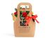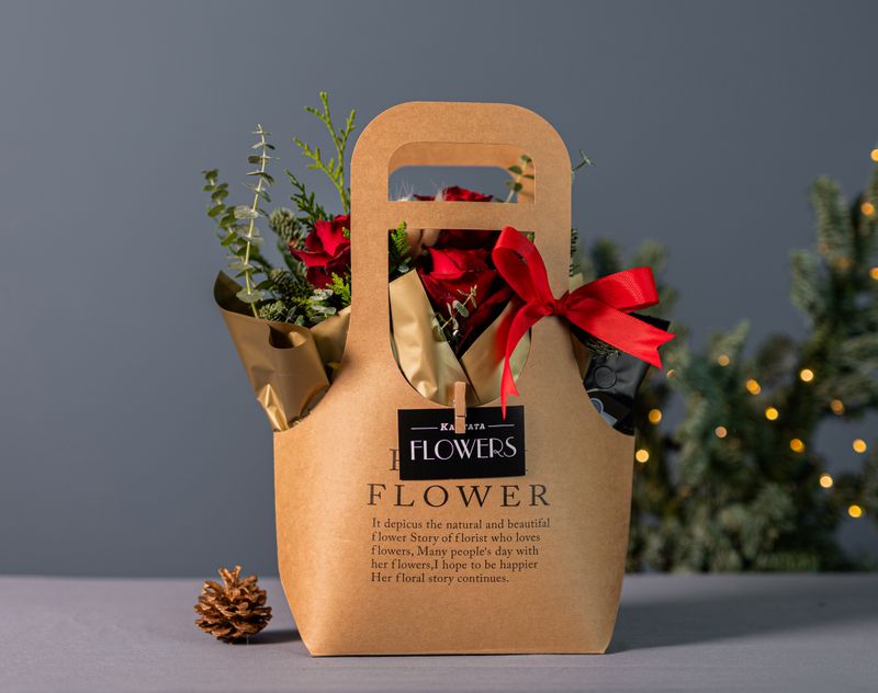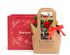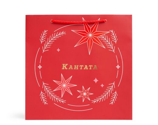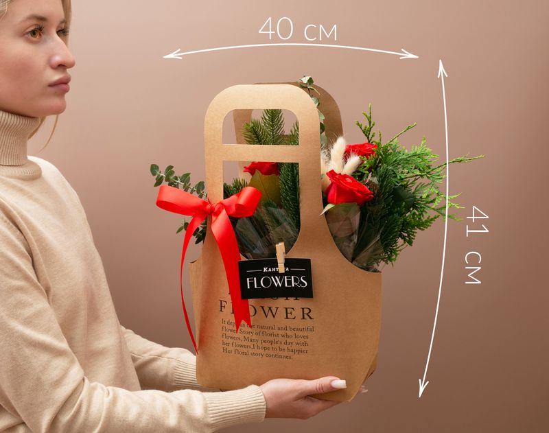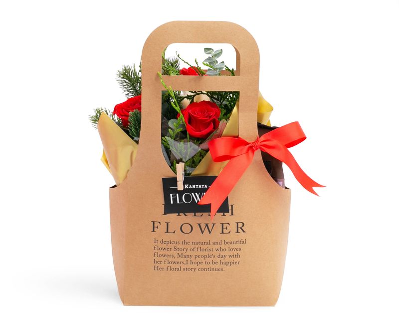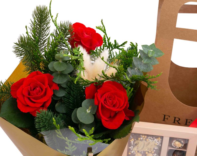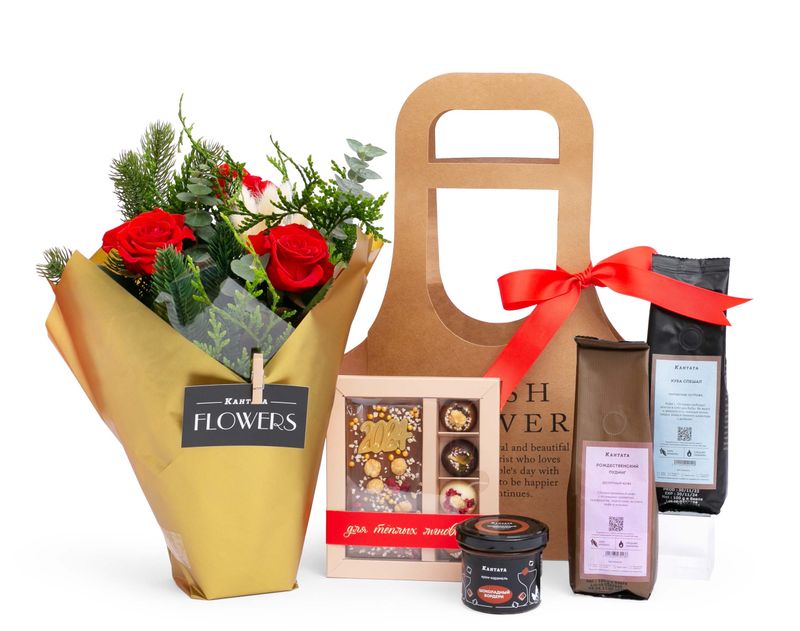 Изящная сумочка, украшением которой стали розы, живой лапник, туя и эвкалипт. Под цветочной композицией — праздничный кофе «Рождественский пудинг» и классический сорт Куба Спешал, а также аппетитные десерты — крем-карамель «Шоколадный Бордери» с согревающим вкусом и набор десертов ручной работы «Для тёплых мгновений».