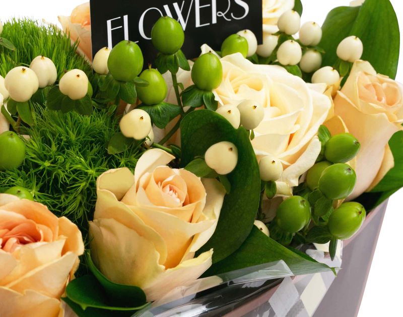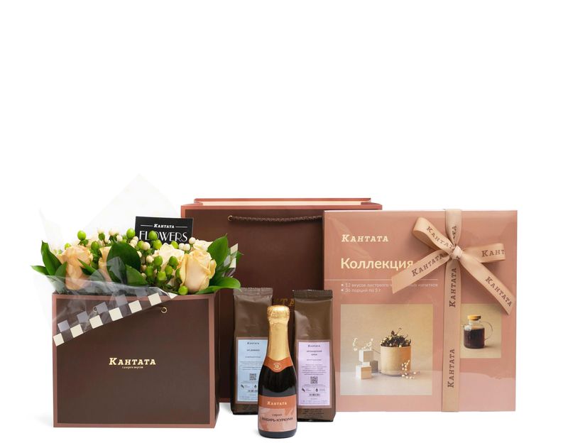 Этот изящный подарок составлен из ароматного кофе двух сортов и целой коллекции чая, дополнен ароматным сиропом с имбирем и куркумой и украшен композицией из нежных живых роз, диантусов, гиперикума и листочков рускуса.