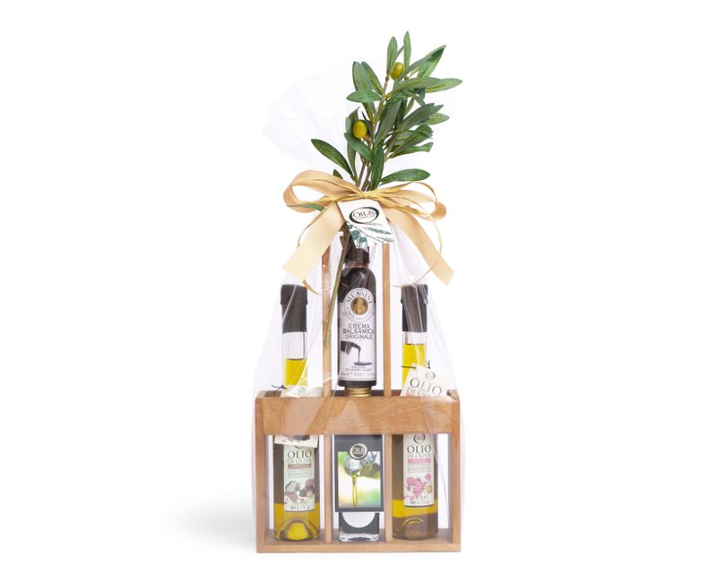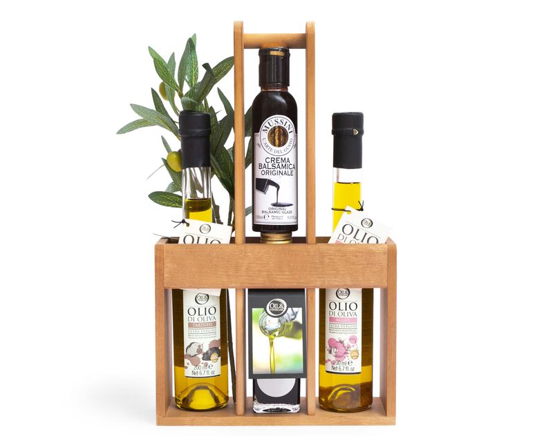 Изящный гурмэ-набор, который мы составили из ароматных оливковых масел с трюфелем и чесноком, добавили уксус с инжиром, а также классику – густой бальзамический уксус.