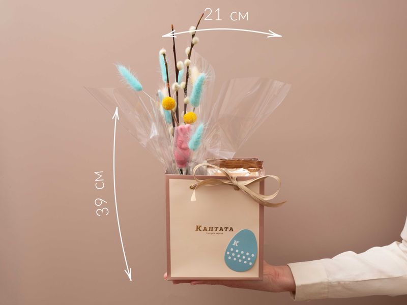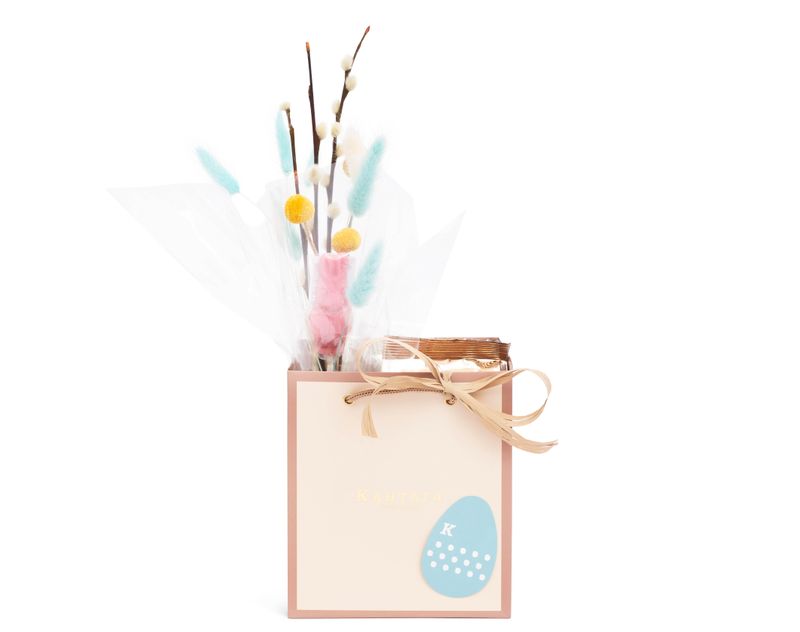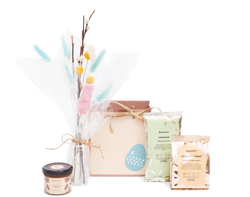 Нежная сумочка, чтобы от души поздравить с Пасхой! Подарок украшают живые веточки пушистой вербы, а внутрь мы вложили душистый купаж черного чая «Весенний аромат!» и зеленый чай «Гармония» с черникой. Тягучая крем-карамель «Пикантный орешек» и шоколадный символ Пасхи «Братец Кролик» дополнят сладкой нотой согревающие напитки, а изящная бутылка «Мараска» станет стильным и полезным аксессуаром на кухне.