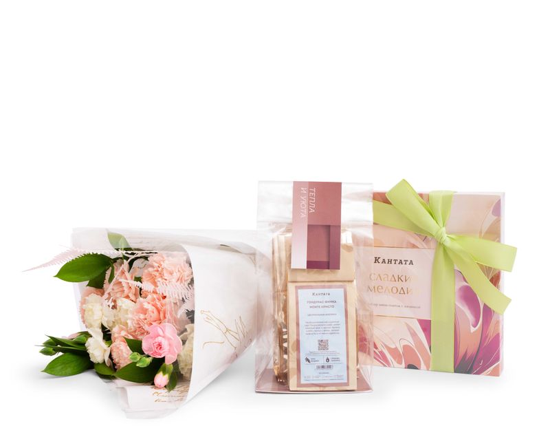 Этот набор – точно летний день, полный благоухания цветов! Центром подарка стала композиция из живых гвоздик и листочков рускуса, рядом с которыми мы поместили напитки и десерты. В наборе – классический кофе «Гондурас Финка Монте Кристо» для бодрого начала дня и купаж черного чая «Сладкий вечер» для гармонии перед сном, а также набор шоколада ручной работы – шесть вкусов для шести неповторимых впечатлений!