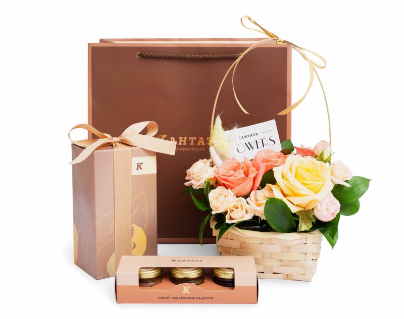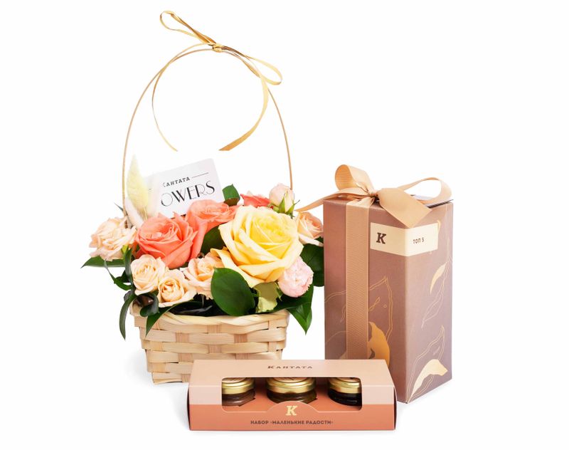Стильный подарок, украшенный живыми цветами. В набор мы вложили пять видов ароматного чая – классику и купажи на любой вкус. На десерт в подарке найдется набор из трех десертов в баночках «Маленькие радости».