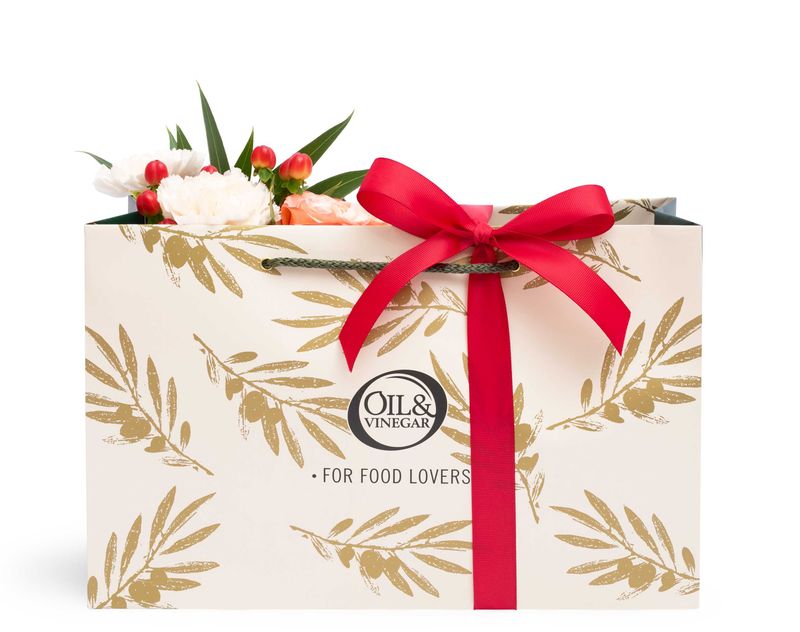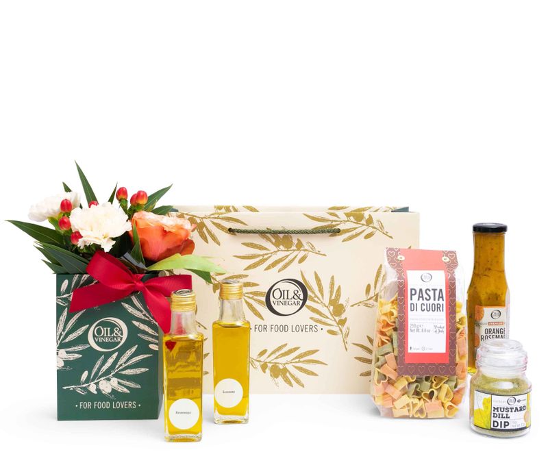 Многогранная палитра вкусов – как на ладони, ведь в этом подарке – аппетитная паста в форме сердечек, душистые оливковые масла «Ночеллара» и «Бонсекко» и пряные специи – дип из горчицы с укропом. Подарок украшает композиция из живых роз и гвоздик с веточками эвкалипта и ягодками гиперикума, которые дополнят волшебное праздничное настроение.