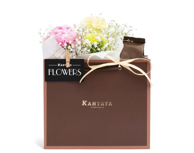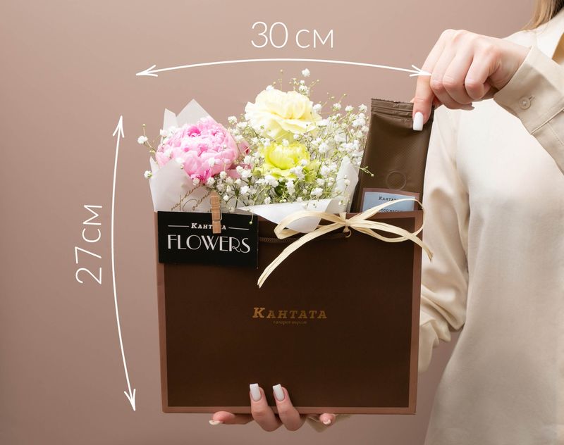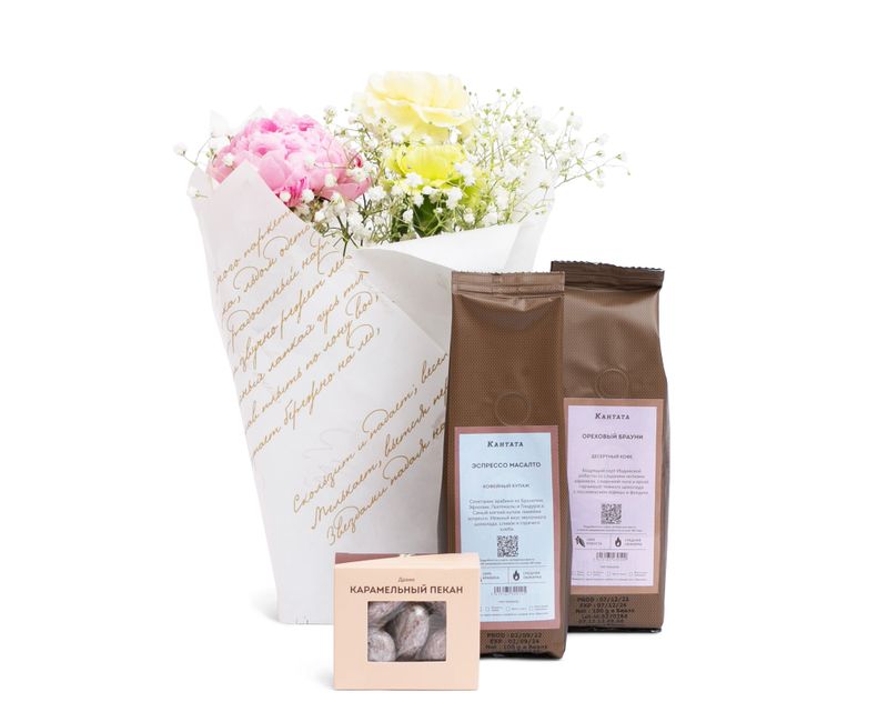 Этот подарок — словно дорогая сердцу поэзия! Сумочка украшена живыми нежными цветами, а внутри подарка находятся два насыщенных кофе — десертный сорт «Ореховый Брауни» с ароматом известного десерта, а также классический сорт «Эспрессо Масалто» с обволакивающей нотой шоколада и сливок. На десерт — аппетитные драже «Карамельный пекан», которые станут отличным дополнением к чашечке кофе.