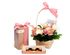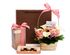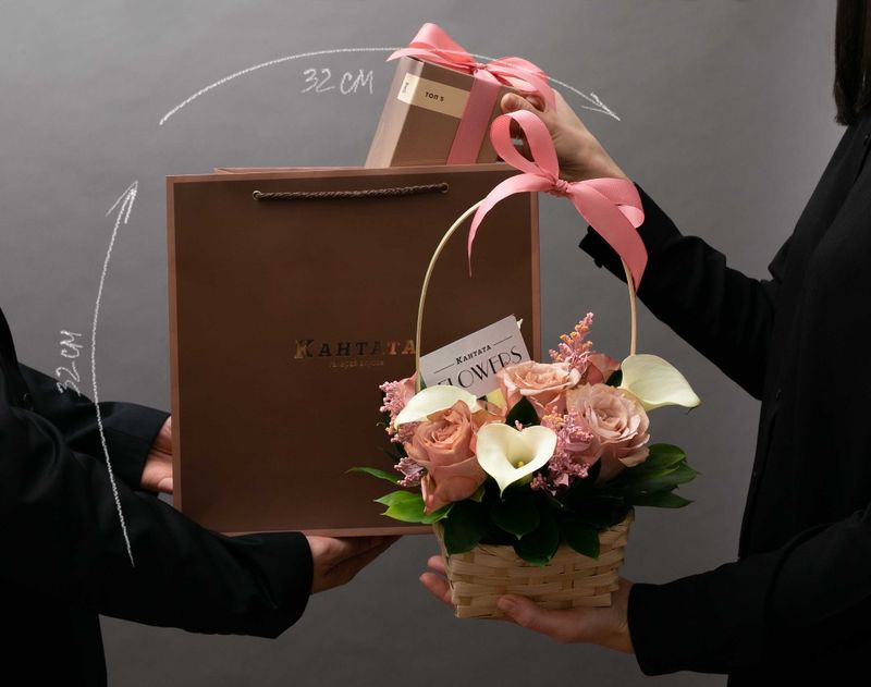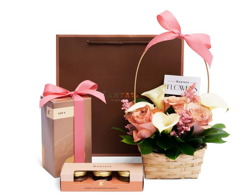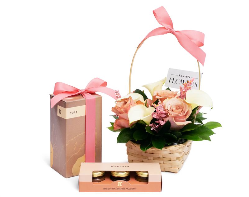 В эту корзину мы поместили нежную цветочную композицию из роз и калл, дополнили подарок пятью лучшими сортами чая из нашего ассортимента и набором «Маленькие радости» из трёх баночек с аппетитными десертами.