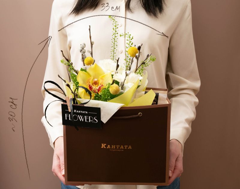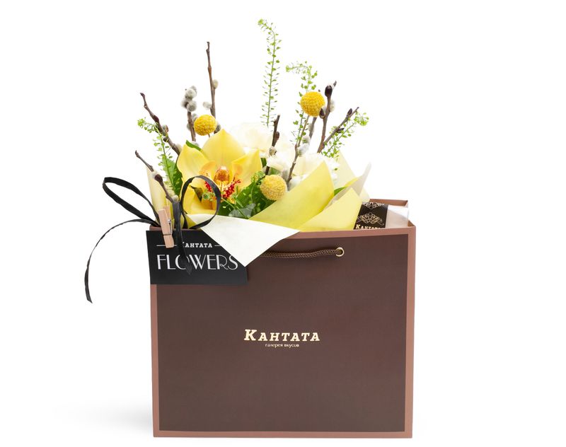 Украсьте Пасху вместе с этой нежной цветочной композицией! В подарке мы собрали живые ароматные орхидеи и гвоздику, дополнили их сочными листьями рускуса, краспедией и тиласпией, а также пушистой вербой — символом праздника. В дополнение к цветам вложили легендарный молочный улун «Огненный цветок» в удобных пирамидках для заваривания, а к чаю — шоколадные яйца «Акварель» с тремя разными вкусами, которые сделают Пасху еще ярче.