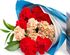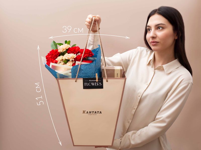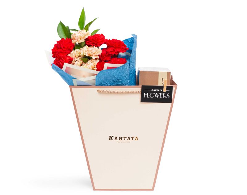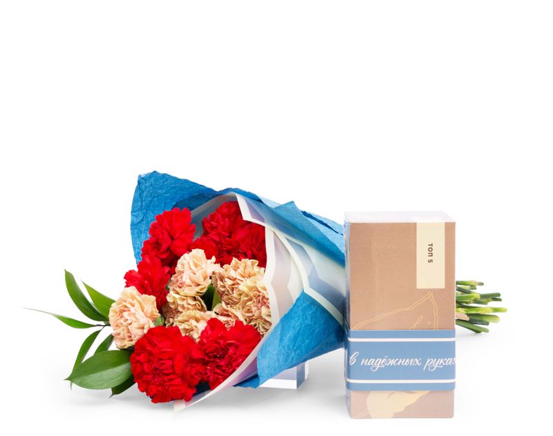 Яркий весенний букет, центром которого стала композиция из живых гвоздик и рускуса. В подарок мы также поместили набор из пяти сортов чая, так горячо любимых нашими гостями!