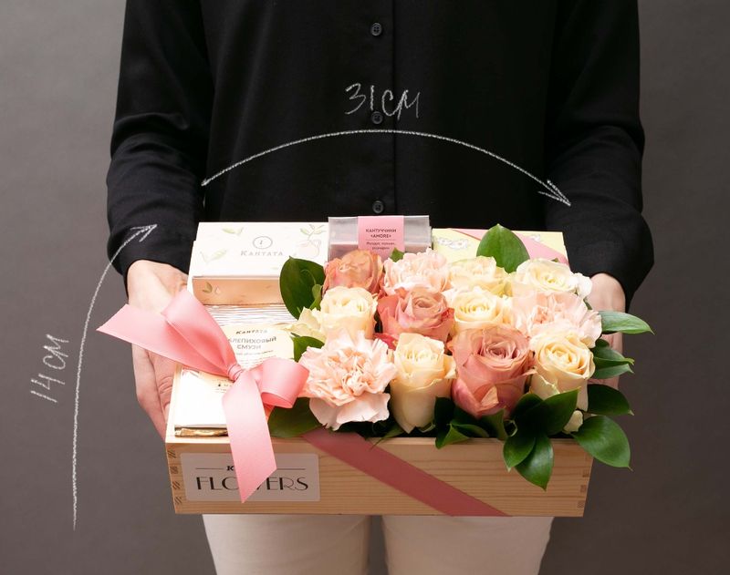 Сладкая продукция в подарочном наборе может быть изменена на аналогичную по типу и стоимости. Цвет живых растений может незначительно отличаться.