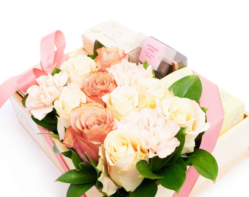 В нашем подарке мы собрали душистую цветочную композицию и ароматные согревающие чаи — нежный «Облепиховый смузи», насыщенная «Клубника с дыней», сливочный «Огненный цветок» и освежающая «Японская липа». На десерт в подарке найдутся марципаны в темном шоколаде и тающее во рту печенье-кантуччини с фундуком и пряностями.