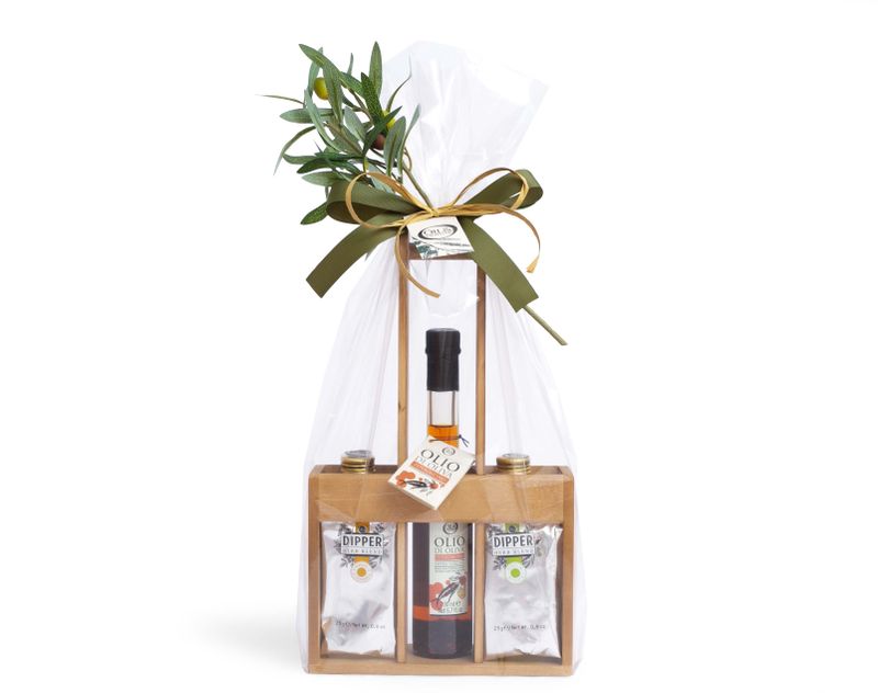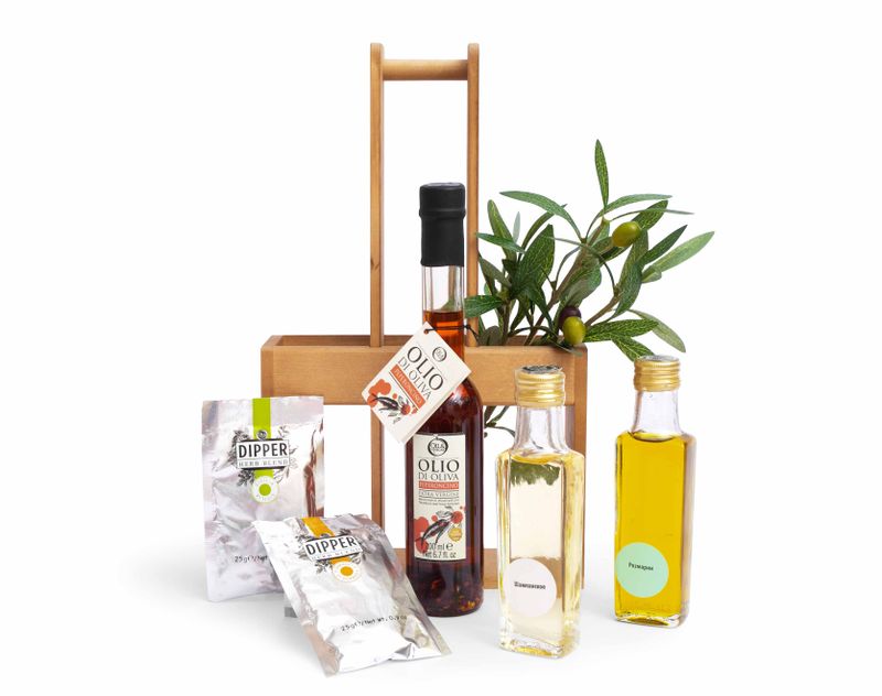 Гурмэ-набор для вашего великолепного застолья! На стильной деревянной стойке – оливковое масло с перчиком чили и масло с душистым розмарином, уксус с освежающим вкусом игристого шампанского. Также в наборе представлены специи – смесь трав с сыром «Пармезан» и дозаправка из пряных, чуть сладковатых трав «Дип Сицилия».