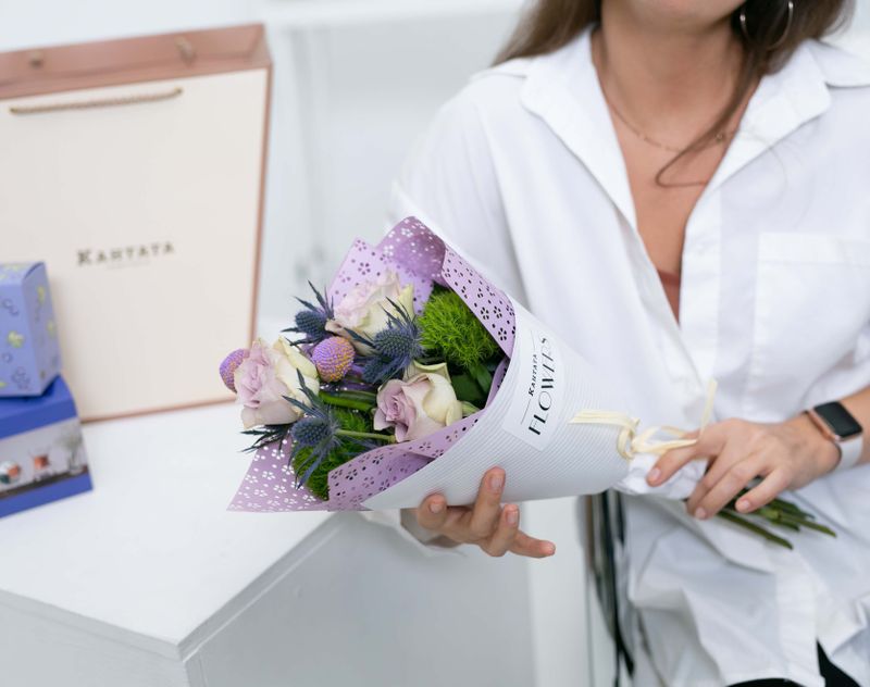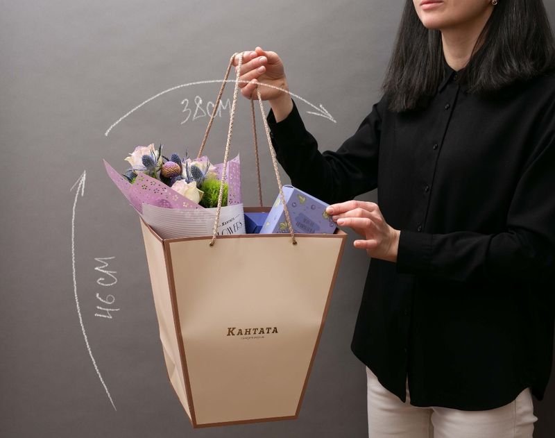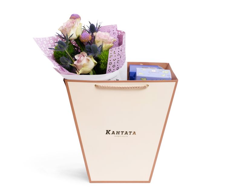 Под великолепной цветочной композицией скрывается насыщенный классический кофе «Катюша Бленд», согревающий купаж «Чёрная смородина» и аппетитные драже «Мишкин завтрак».