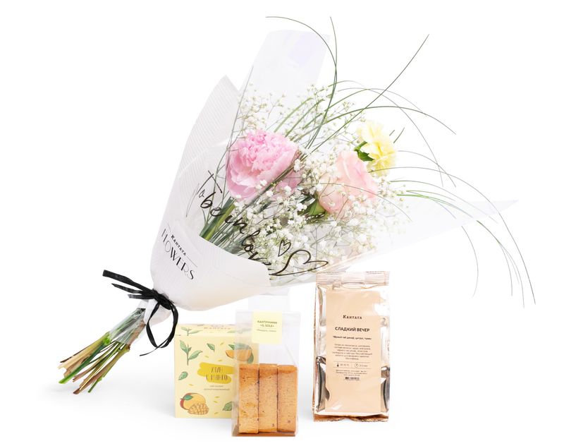 Изящный подарок, который станет самым приятным сюрпризом! Украшением его стала цветочная композиция, также в подарок мы добавили ароматный купаж «Сладкий вечер» и улун с манго, а на десерт — тающее во рту печенье-кантуччини с миндалём и лимоном.