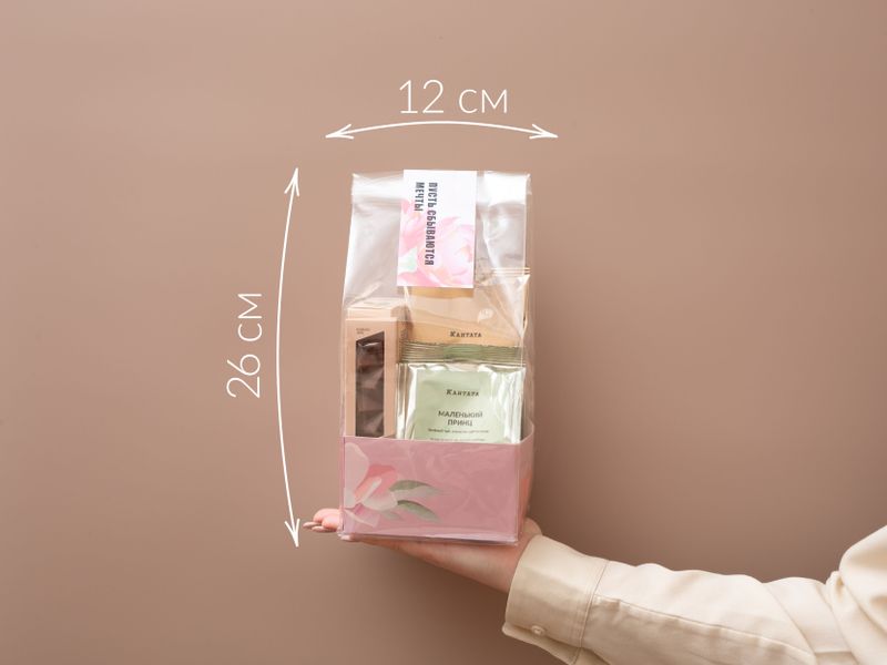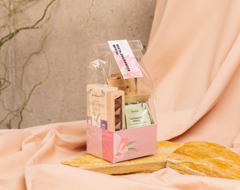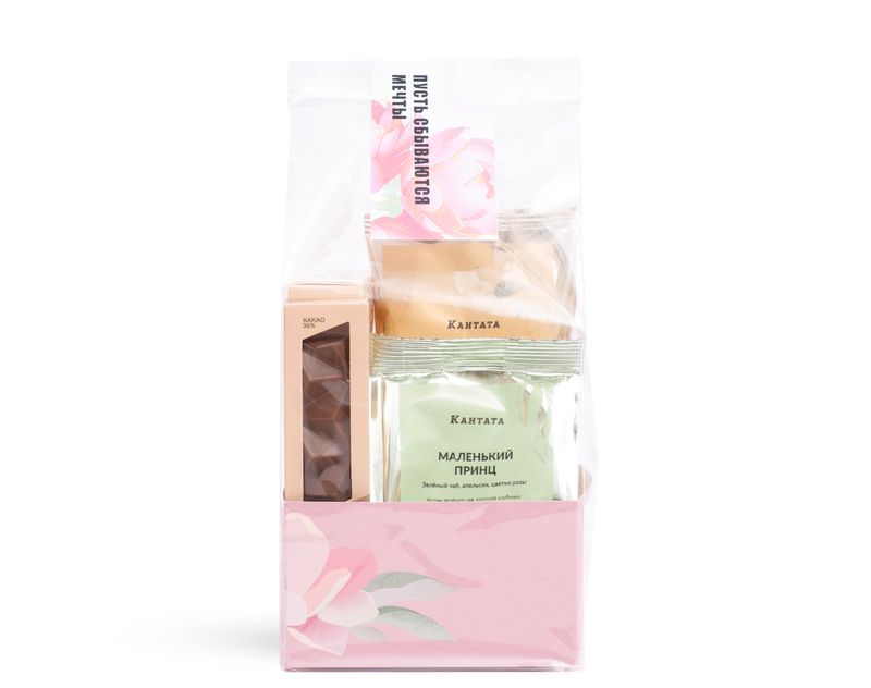 Нежный комплимент, который точно придётся по душе! В подарок мы поместили вдохновляющий зеленый чай «Маленький принц» и черный чай «Соусеп» с теплым фруктовым звучанием, а для их удобного заваривания добавили индивидуальные фильтр-пакеты. На десерт к напиткам — плитка аппетитного шоколада ручной работы «Нежные облака».
