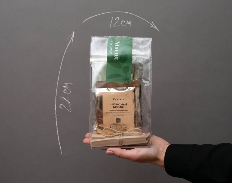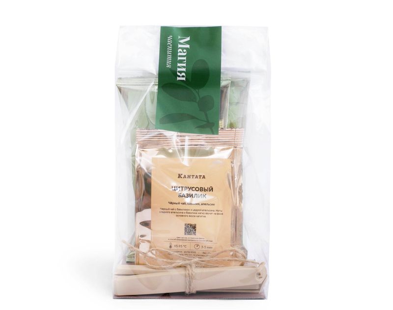 Три вида чая – три ярких эмоции! В подарке – ягодный купаж зеленого чая «Все девушки любят малину» и «Огни ночного города» с ягодами клюквы, цедрой апельсина и лепестками календулы, а также пряный черный чай «Цитрусовый базилик». Эти напитки сделают любое чаепитие уютным и согревающим, а чтобы любимый чай надолго сохранил вкус и аромат, мы добавили в набор стильный зажим для пакетов с логотипом Кантаты.