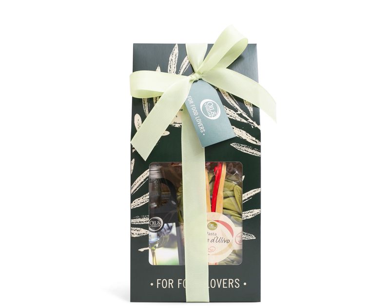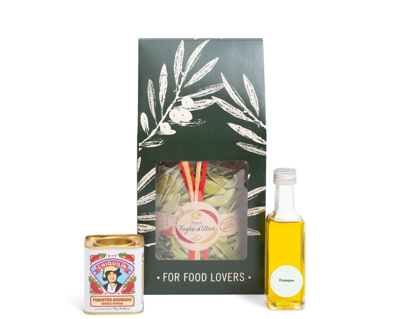 Идеальный гарнир здесь! В подарке — изысканная паста в форме листочков оливы, душистое оливковое масло с розмарином, копченая паприка — и ничего лишнего!