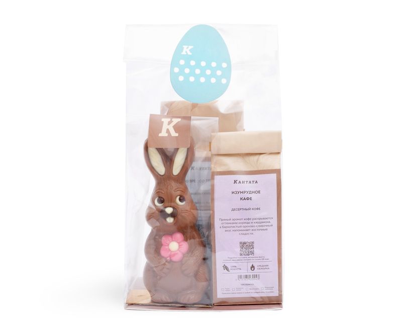 Подарите дорогому Вам человеку яркие эмоции на праздник Пасхи! В этом подарке найдутся насыщенные и бархатистые сорта кофе — десертный «Изумрудное кафе» с согревающими нотами пряностей и «Эспрессо Триест» — классическая арабика с робустой, которая взбодрит оттенками грецкого ореха и горького шоколада. На десерт — символ Пасхи, улыбающийся шоколадный зайчик.