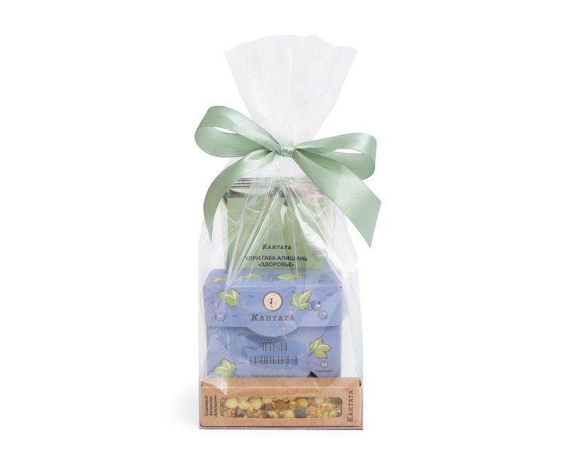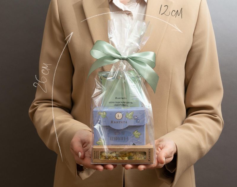 В прозрачную форму мы поместили два вида чая – купаж “Черная смородина” в индивидуальный заварочных пакетиках и габа улун Алишань с ягодными и пряно-хлебными нотами во вкусе. На десерт в набор добавили злаковый батончик с апельсином.