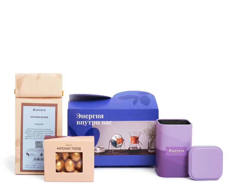 В дизайнерскую коробку мы вложили классический купаж арабики «Катюша бленд», на основе которого любой напиток окажется удивительно вкусным. Чтобы зерна не потеряли свой вкус, поместили в набор стильную баночку для хранения. На десерт добавили нарядное драже «Мускат Голд».