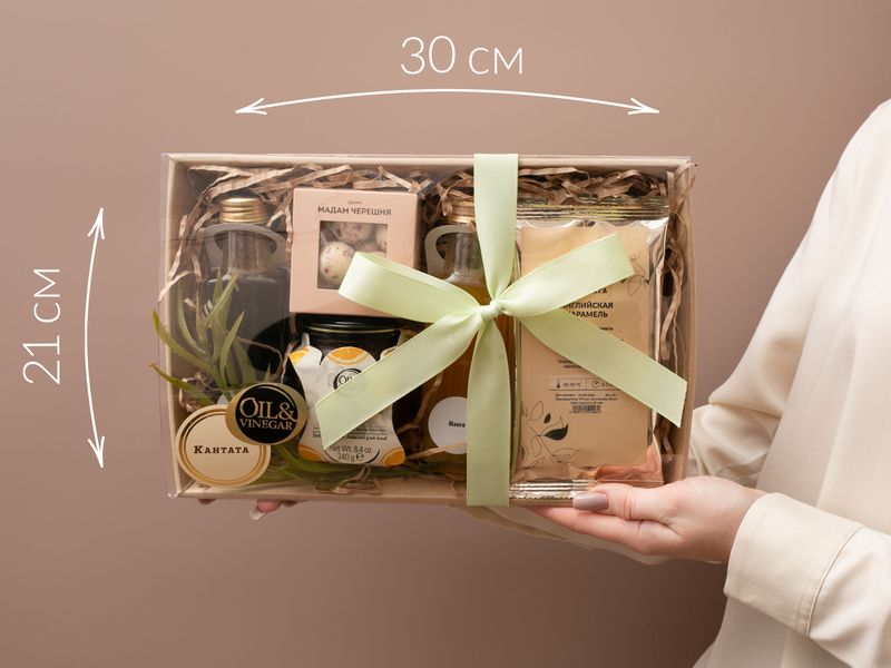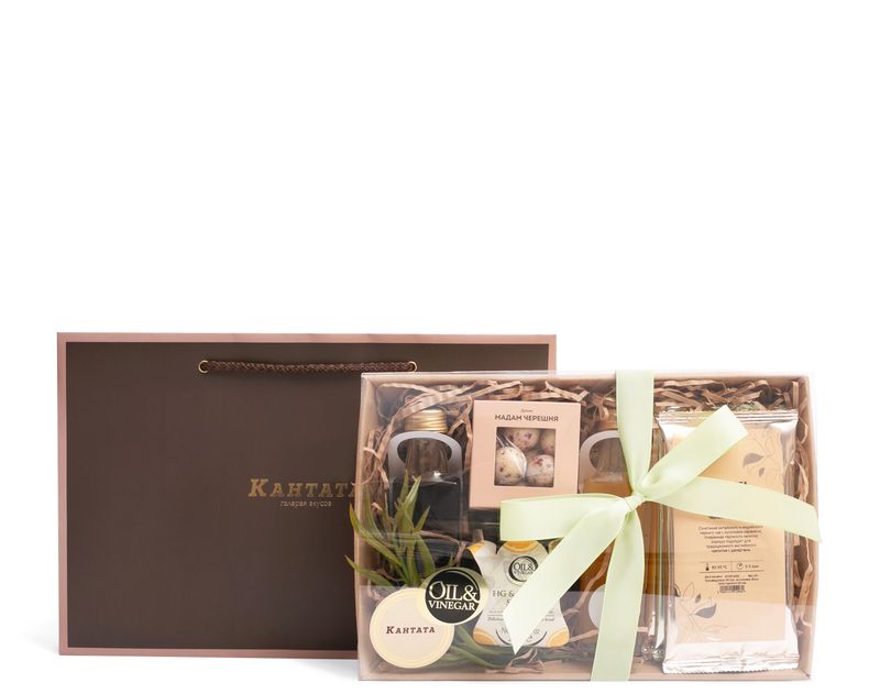Подарок, полный солнечных вкусов! В наборе мы объединили ингредиенты для вашего стола — спрэд с инжиром и апельсином, а также два ярких уксуса: с манго и с инжиром, которые так вкусно использовать в качестве топпингов! Добавили и напитки — купажи черного чая с насыщенным звучанием «Английская карамель» и «Клубничные сливки», купаж зеленого чая «Аромат путешествий» с грушей и бергамотом. Нежные драже из белого и молочного шоколада «Мадам Черешня» дополнят любимые напитки сочной ягодной нотой.