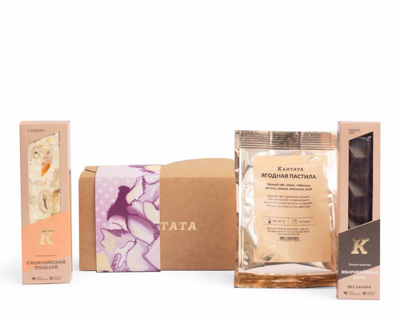 Презент для самой-самой! В набор мы положили купаж на основе черного чая «Ягодная пастила», а на десерт в подарке найдется нуга и тающая во рту плитка шоколада.
